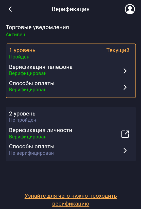 В данном разделе отображены все уровни верификации, доступные в приложении RedWallet.