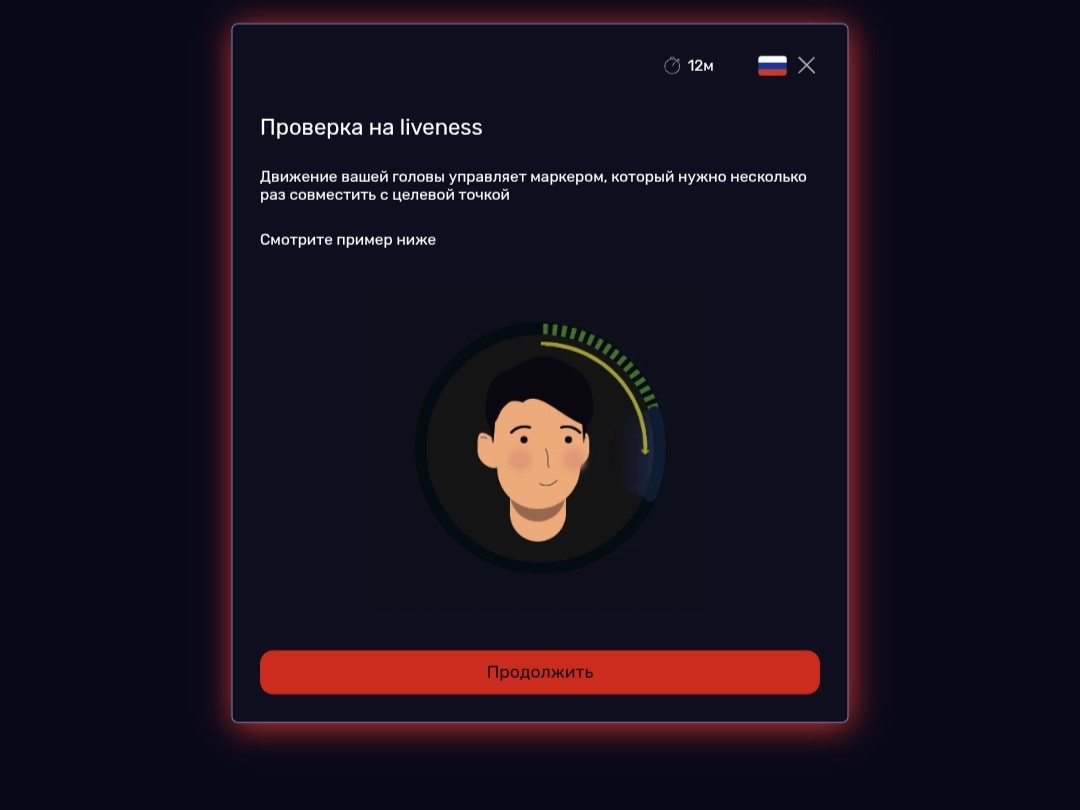 После проверки паспорта и фото с документом запускается liveness-проверка. Система попросит выполнять движения головой по подсказкам на экране, чтобы совместить маркер с целевой точкой.