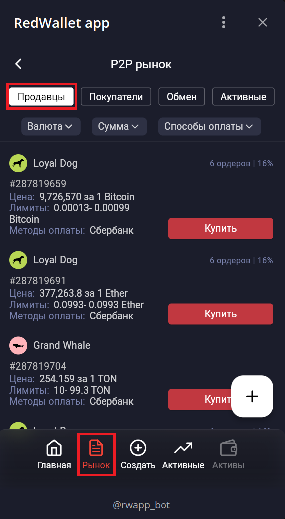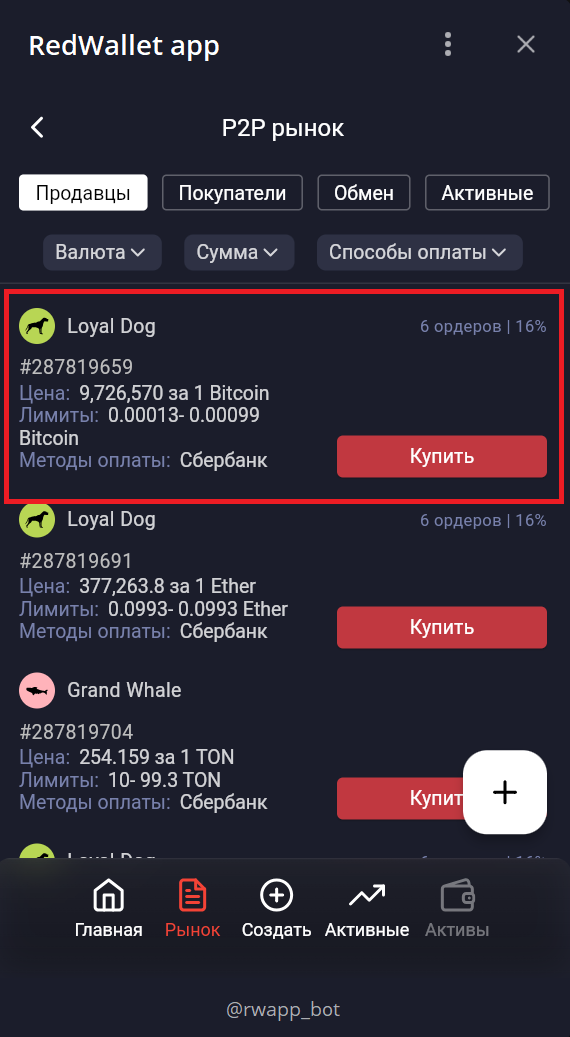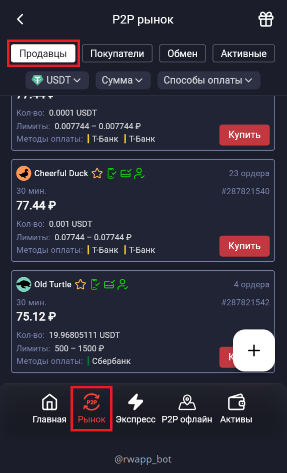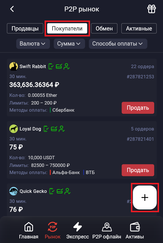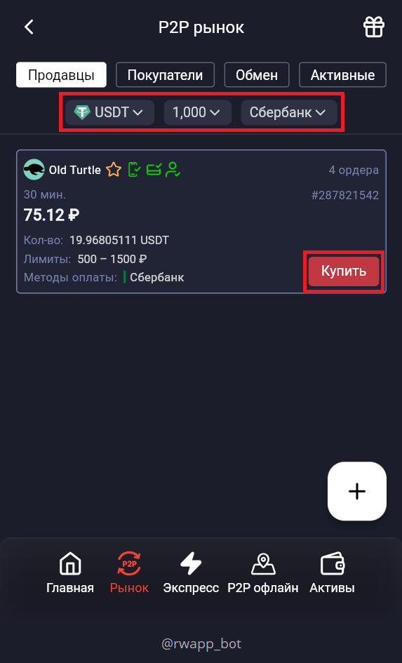 Здесь отображается список активных продавцов и мерчантов, которые готовы продать криптовалюту. Можно использовать фильтры для поиска подходящих объявлений по сумме, валюте или способу оплаты.