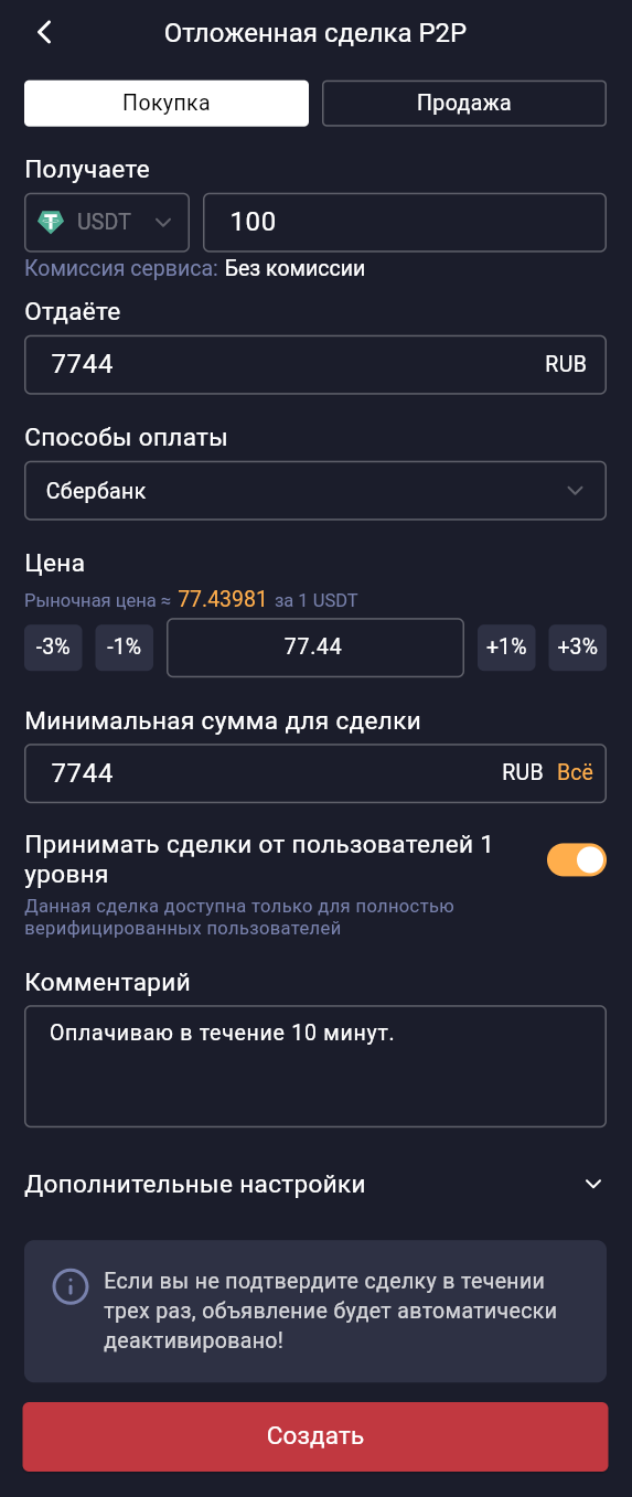 Минимальная сумма для сделки: можно задать пределы, чтобы ваш криптовалютный ордер исполнялся по частям. Например, если вы покупаете большую сумму, покупатели смогут продавать вам токены небольшими частями в рамках установленных границ.