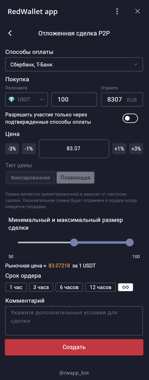 Комиссия сервиса: перед подтверждением отображается сумма комиссии RED Wallet за проведение операции.