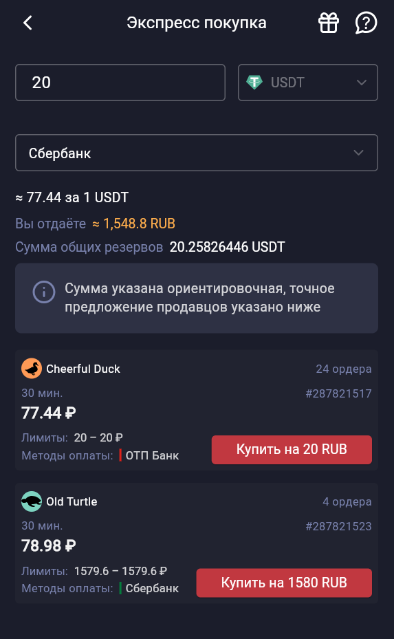 Функция «Экспресс покупка» создана для тех, кто хочет приобрести криптовалюту быстро и без лишних шагов. Вам не нужно самостоятельно искать продавца на рынке — система автоматически подберёт подходящее предложение.