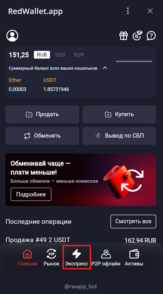 На главном экране кошелька нажмите кнопку «Экспресс».