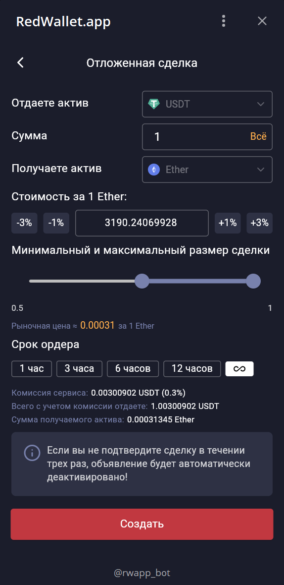 Перед созданием сделки убедитесь, что курс, сумма и условия вас устраивают.