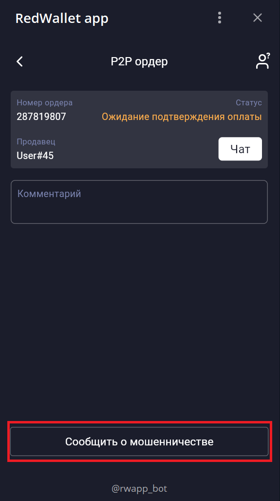 Если вторая сторона не подтверждает поступление средств или возникли другие проблемы, у пользователя появляется возможность подать жалобу нажав на кнопку «Сообщить о мошенничестве».