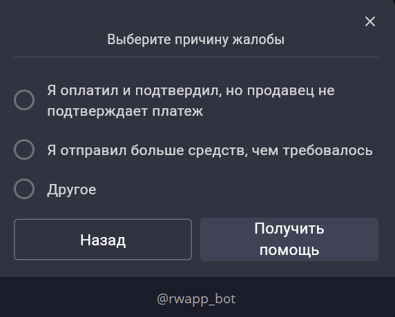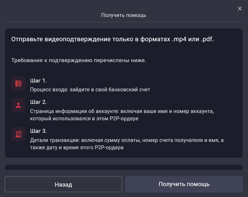 В случае, если при совершении P2P-сделки возникают проблемы (например, средства были отправлены, но продавец не подтвердил оплату), пользователь может открыть спор и связаться со службой поддержки.