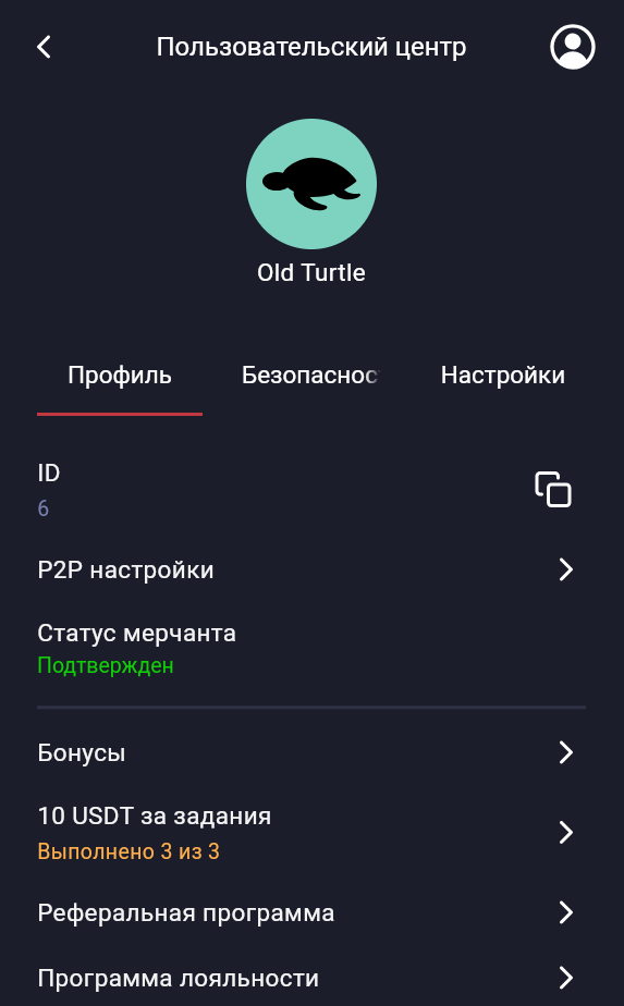 Пользовательский центр — раздел с основными настройками кошелька. Здесь находятся: