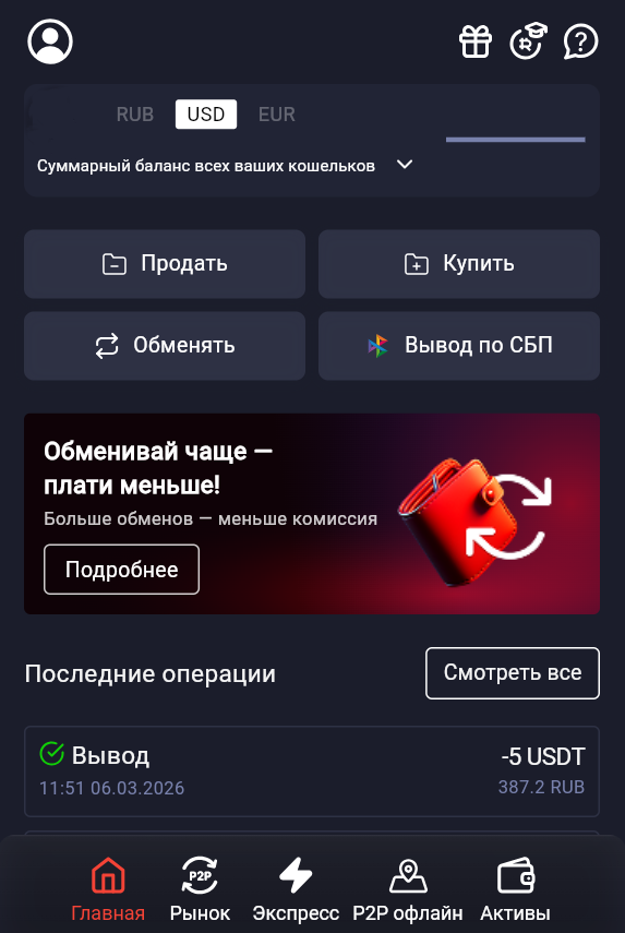 Главная страница — здесь отображается баланс в рублях и криптовалюте (BTC, USDT, TON и др.). В разделе меню также будет доступна:
