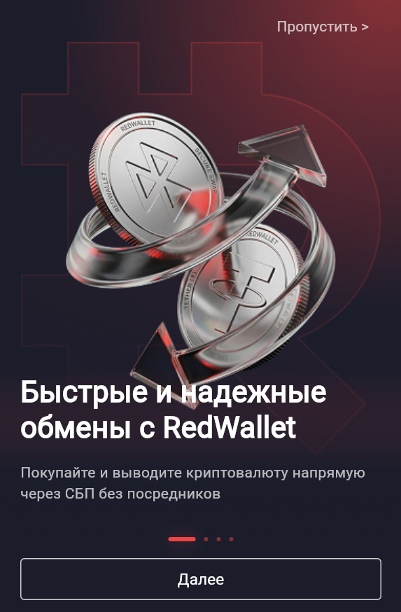 После запуска приложения вы попадёте в приветственный раздел. Здесь мы расскажем о ключевых возможностях RedWallet и покажем, как им пользоваться. Просто листайте экраны и нажимайте «Далее».