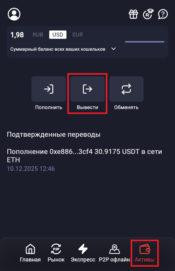 Откройте приложение RedWallet и в нижнем меню перейдите во вкладку «Активы».