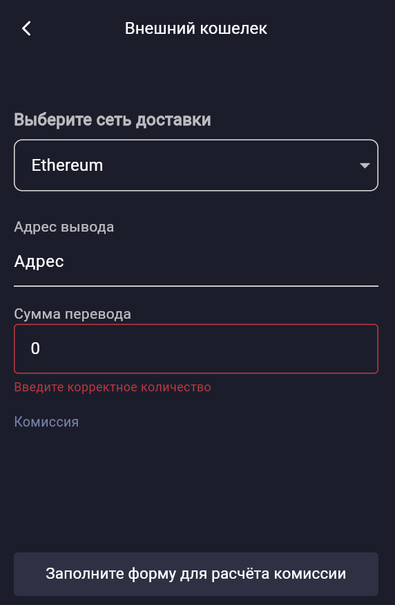 Вставьте адрес внешнего кошелька, на который будет выполнен вывод, и укажите сумму перевода.